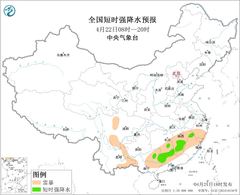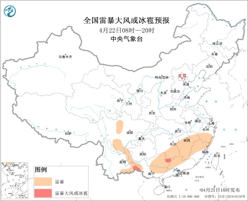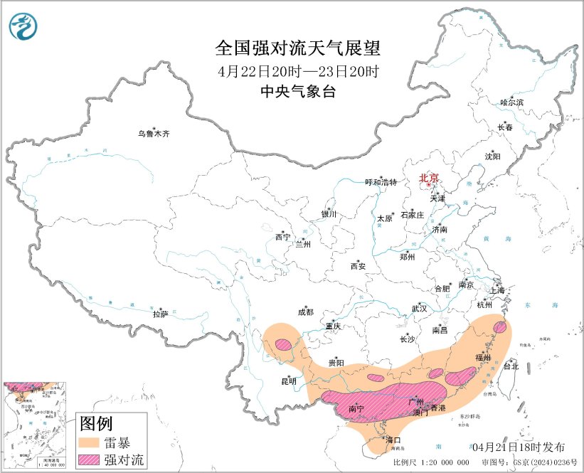 预测4月22日20时至23日20时,四川南部、浙江东南部、福建东南部、广西中南部、广东中南部等地的部分地区将有强对流天气。