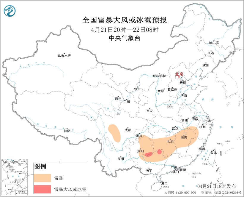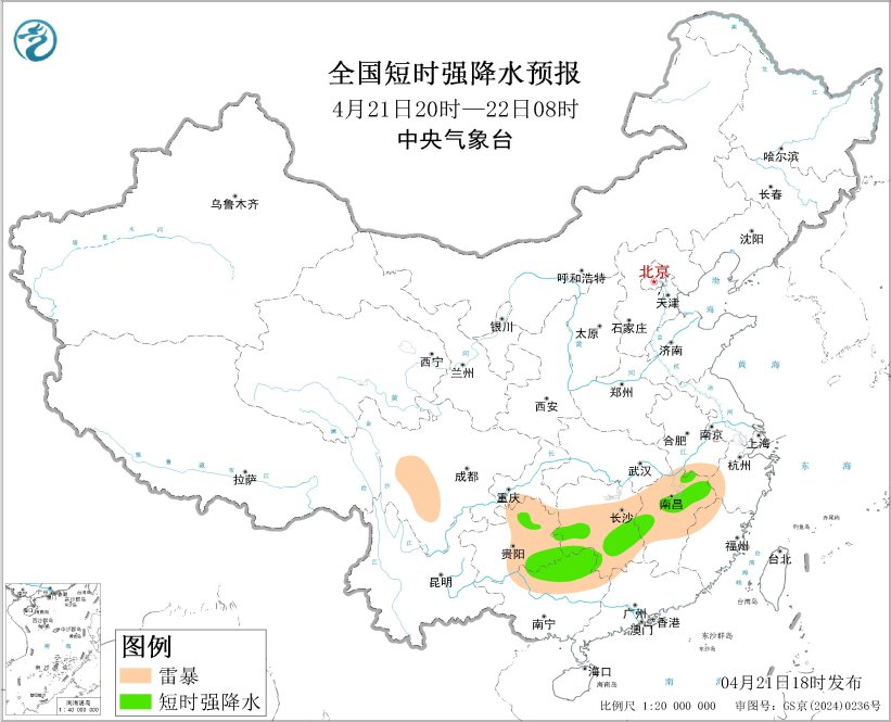 预测4月21日20时至22日20时,天博体育app贵州东部、湖南中南部、江西、广西北部、广东北部等地的部分地区将有短时强降水天气,小时雨量20-40毫米,开云局地可达50毫米以上;另外,贵州东南部、云南东南部、广西北部、广东西北部等地的局地将有雷暴大风或冰雹天气。