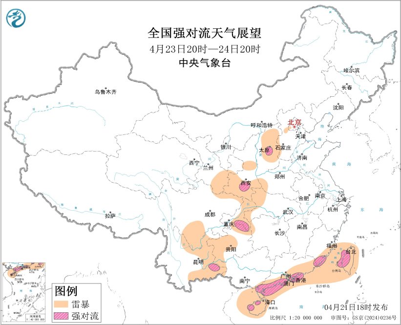 预测4月23日20时至24日20时,陕西南部、山西中部、重庆南部、贵州东北部、福建东南部、云南东南部、广东南部、海南岛西北部、台湾岛中西部等地的部分地区将有强对流天气。