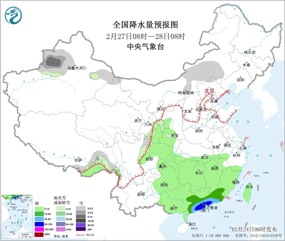 其中25日至27日,西北地区东部、内蒙古东部、华北北部、东北地区小到中雪或雨夹雪;江淮、江南、华南、贵州东部等地小到中雨,局地大到暴雨。