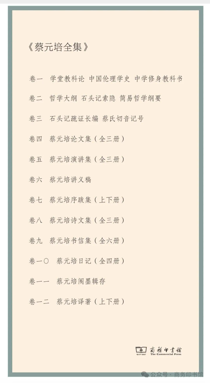 新版《蔡元培全集》的编纂出书,获取商务印书馆的鼎力赞助。蔡元培先生与商务印书馆渊源深厚,缘于蔡元培先生与张元济同乡、同岁,又同为光绪壬辰(1892年)进士,同入晚清政府为官,不仅年谊深厚,更是志同说念合。蔡元培先生终身抱定教育救国之志,张元济则以"修明教育、开启民智"行为商务印书馆的出书宗旨。