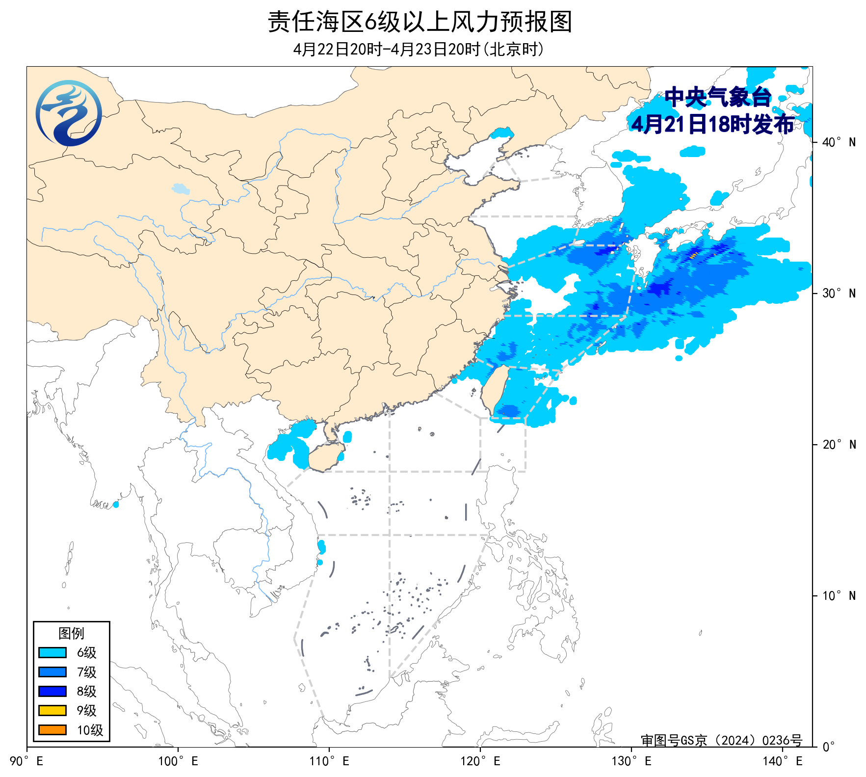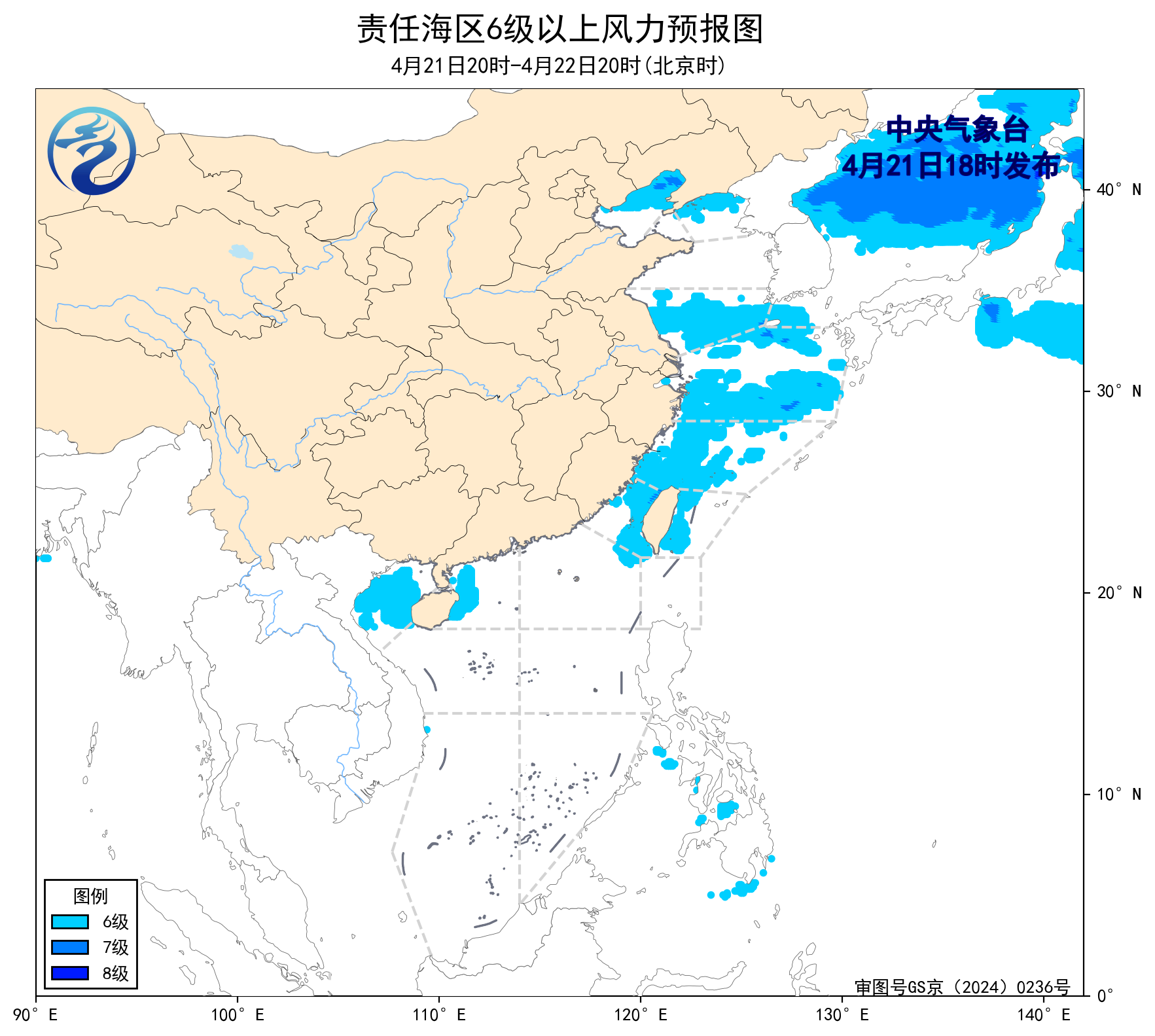 4月21日02时至14时,黄海北部海域、北部湾出现了5~6级、阵风7级的偏南风或西南风,东海北部海域出现了5~6级、阵风7级的偏北风,东海南部海域出现了5~6级、阵风7级的偏东风。