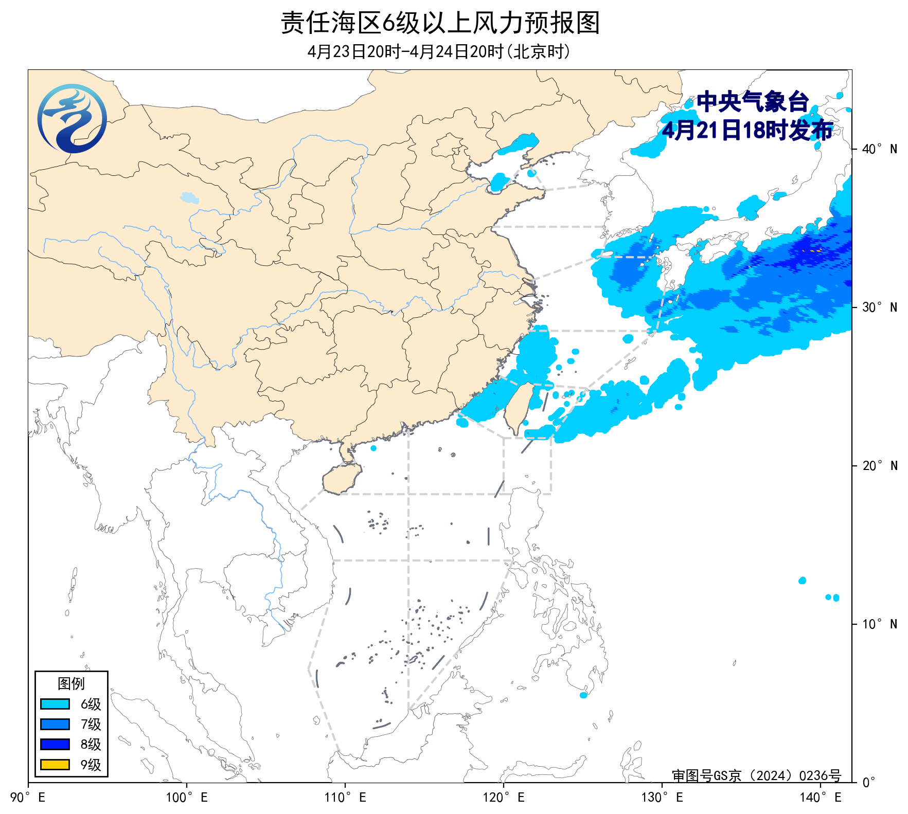 23日20时至24日20时,渤海将有5~6级、阵风7级的西南风,东海大部海域、台湾海峡将有5~6级、阵风7级的东北风。