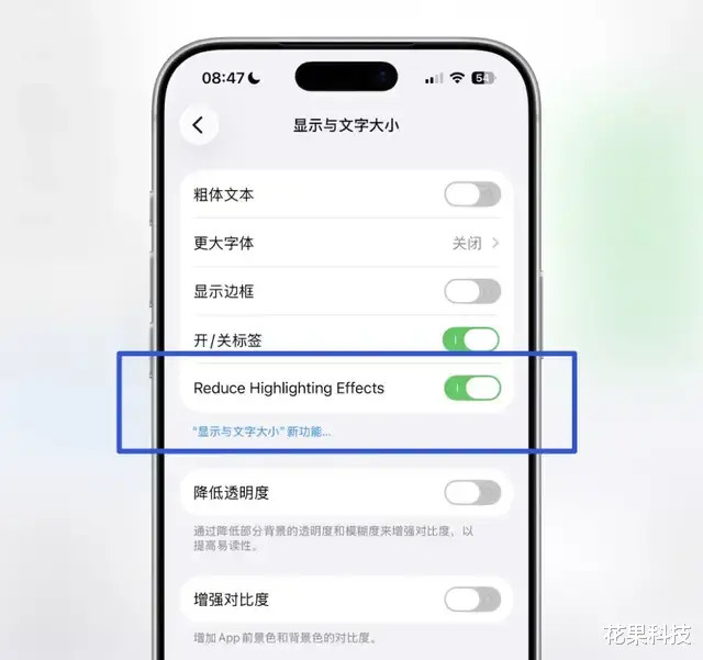 更新后参预到 iPhone 竖立--援救功能--显现与翰墨大小,开云体育新增了一个「Reduce Highlighting Effects」 的开关。