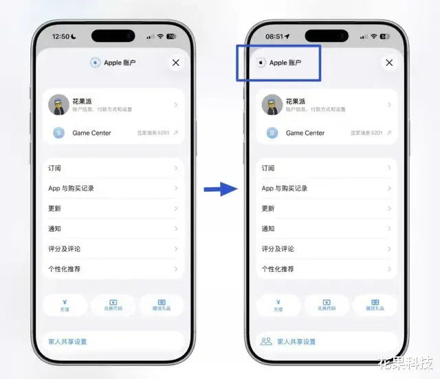 在 App Store 、Apple Music、播客的 Apple 账户界面,底本顶部的「Apple 账户」显现在中间,当今改到了左侧显现。