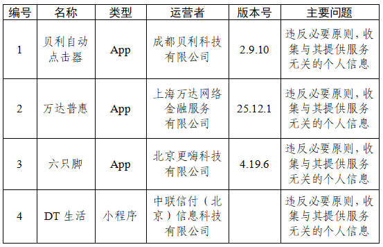 三、贝利自动点击器、万达普惠等4款App违背必要原则,网罗与其提供的就业无关的个东谈主信息。