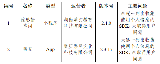二、雅想斩单词、票豆等2款App未逐个列出网罗使用个东谈主信息的SDK,未得回用户应承。